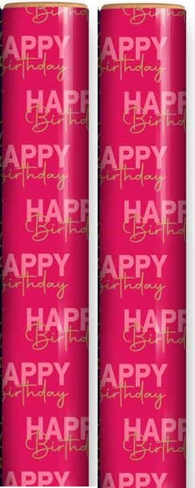 6m Happy Birthday Gift Wrapping Paper Roll - 2 x 3m - Pink with Gold Writing