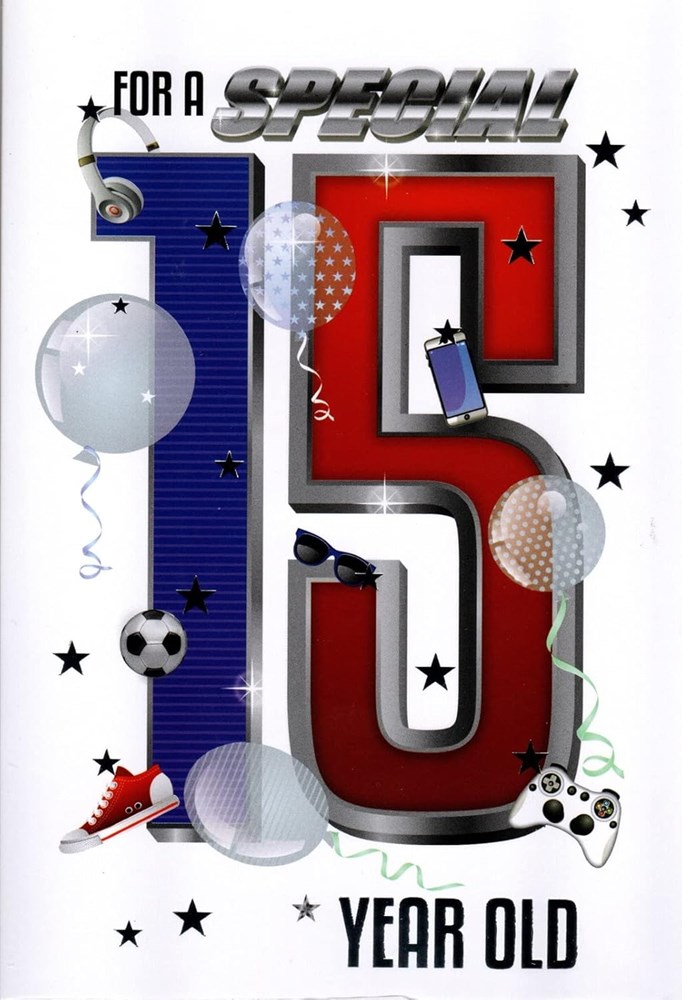 Age 15 Boy Birthday Card With Envelope - Blue and Red Numbers with Headphones Phone Trainer and Games Controller with Silver Foil