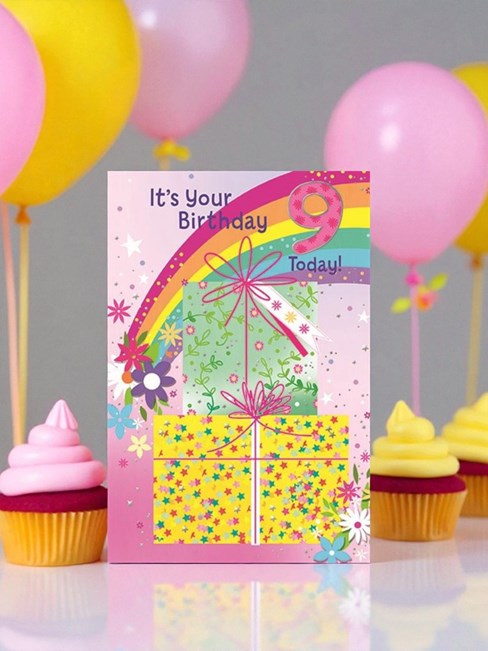 Age 9 Girl Birthday Card With Envelope - Rainbow with Flowers and Stacked Presents, Finished with Silver Foil