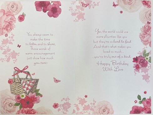 & inside has an insert printed with the same design and reads: You always seem to make the time to listen and to share, Those words of warm encouragement just show how much you care ~ Yes the world could use more Aunties like you but they're so hard to find, and that's what makes you loved so much...you're truly one of a kind. Happy Birthday With Love