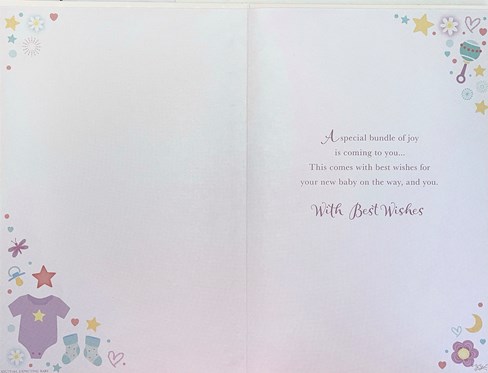 & inside has an insert printed with the same design and reads: A special bundle of joy is coming to you...This comes with best wishes for your new baby on the way, and you. With Best Wishes