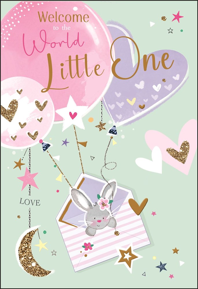 Jonny Javelin New Baby Boy Card With Envelope - Welcome to the World Little One - Grey Rabbit in Striped Envelope with Pink and Lilac Balloons and Gold Foil and Glitter Finish