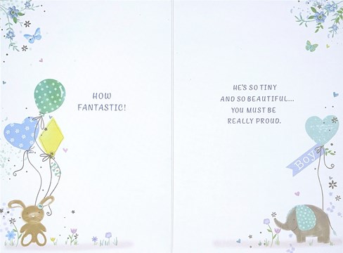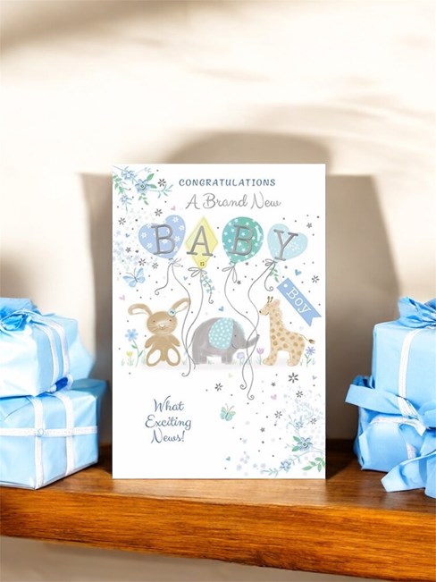Birth Of New Baby Boy Card With Envelope - Animals with Blue and Green Balloons and Silver Foil Finish
