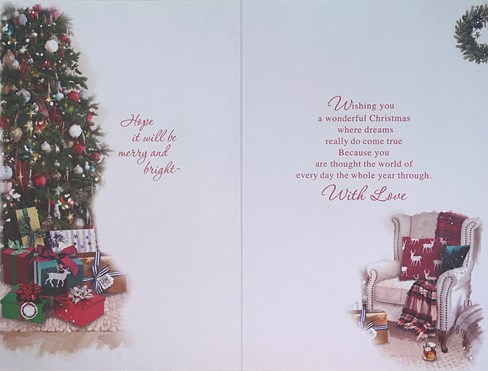 & inside is printed with the same design and reads: Hope it will be merry and bright - Wishing you a wonderful Christmas where dreams really do come true because you are thought the world of every day the whole year through. With Love