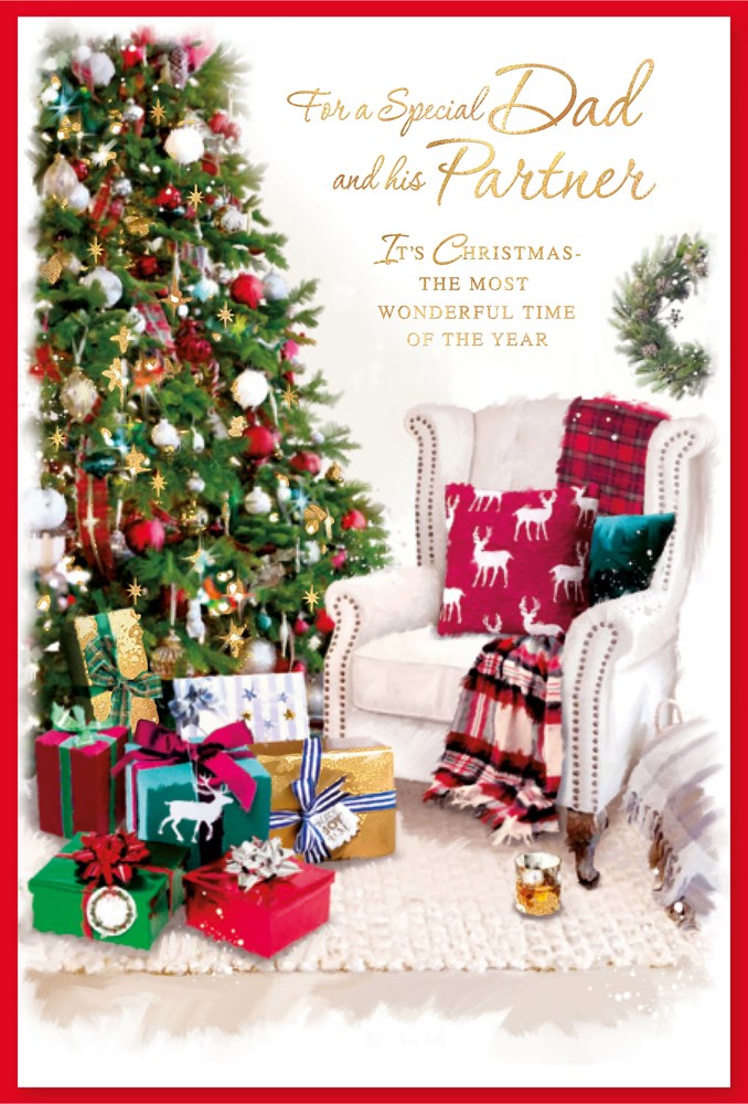 Dad & Partner Christmas Card With Envelope - Xmas Tree, Presents & Chair Finished with Gold Foil