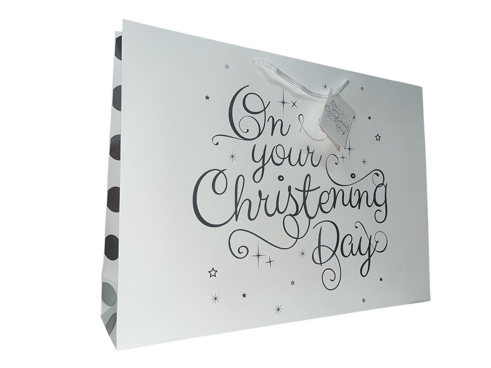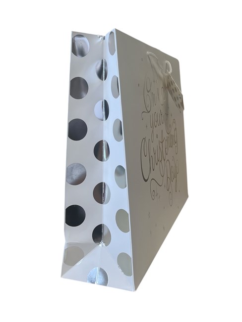 Extra Large Christening Gift Bag - Landscape White with Silver Foil 17.5x13x4"