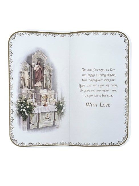 Inside has an insert printed with the same design and reads: On Your Confirmation Day this brings a special prayer, that throughout your life God's Love and Light are there, to guide you and protect you, to keep you in his care. Just For You