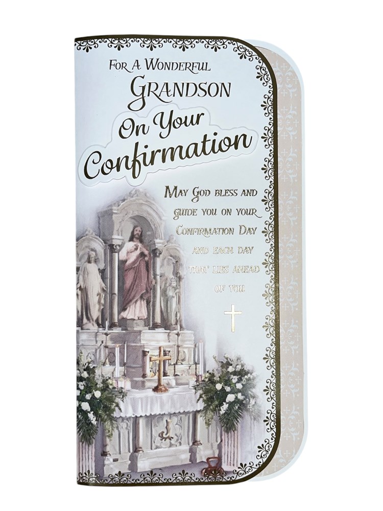 On the front the card reads: For a Wonderful Grandson On your Confirmation Day May God Bless and guide you on your Confirmation Day and each day that lies ahead of you