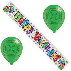 Happy Birthday Party Pack - Silver Birthday Banner, Multicoloured Balloons