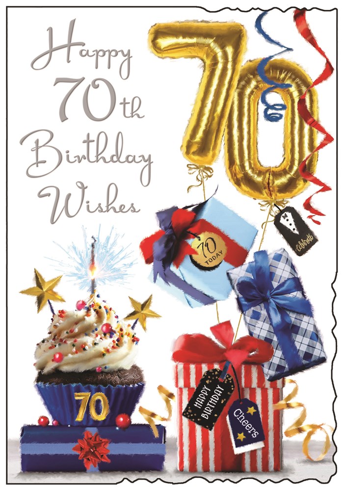Jonny Javelin Age 70 Male Birthday Card & Envelope - Cupcake, Red and Blue Presents, Gold '70' Balloons and Embossed Silver Foil