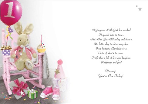 & inside is printed with the same design and reads: A Gorgeous Little Girl has reached A special date in time... She's One Year Old today and there's No better day to shine, may this First fantastic Birthday be a Taste of what's to come... A life that's full of love and laughter, Happiness and fun! Hooray! You're One Today!
