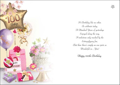 & inside has an insert printed with the same design and reads: A Birthday like no other, to celebrate today, a hundred years of yesterdays enjoyed along the way, a milestone only reached by the extraordinary few, but then there's simply no-one quite as Wonderful as ... You! Happy 100th Birthday