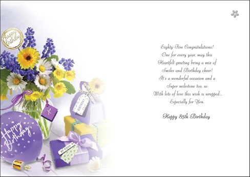& inside has an insert printed with the same design and reads: Eighty-Five Congratulations! One for every year, may this heartfelt greeting bring a mix of smiles and birthday cheer! It's a wonderful occasion and a super milestone too, so with lots of love this wish is wrapped...Especially for you. Happy 85th Birthday