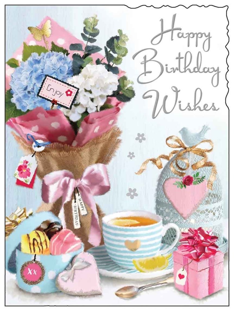 Jonny Javelin Floral Birthday Card & Envelope - Bouquet of Flowers, Teacup and Chocolates with Embossed Silver Foil