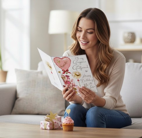 Jonny Javelin Girlfriend Birthday Card With Envelope - Stacked Presents, Pink Heart Balloon and Cupcake Design