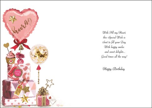 & inside has an insert printed with the same design and reads: With all my heart, this special wish is sent to fill your day, with happy smiles and sweet delights...Good times all the way! Happy Birthday