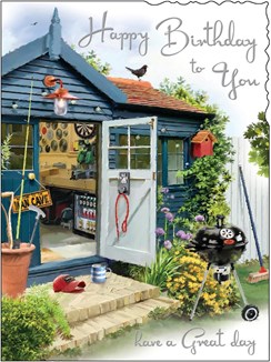 Jonny Javelin Open Male Birthday Card With Envelope - Man Cave Shed in Garden with Silver Foil Detail