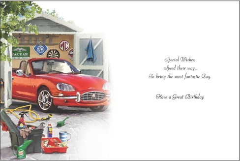 Jonny Javelin Open Male Birthday Card & Envelope - Red Classic Sports Car with Silver Embossed Foil