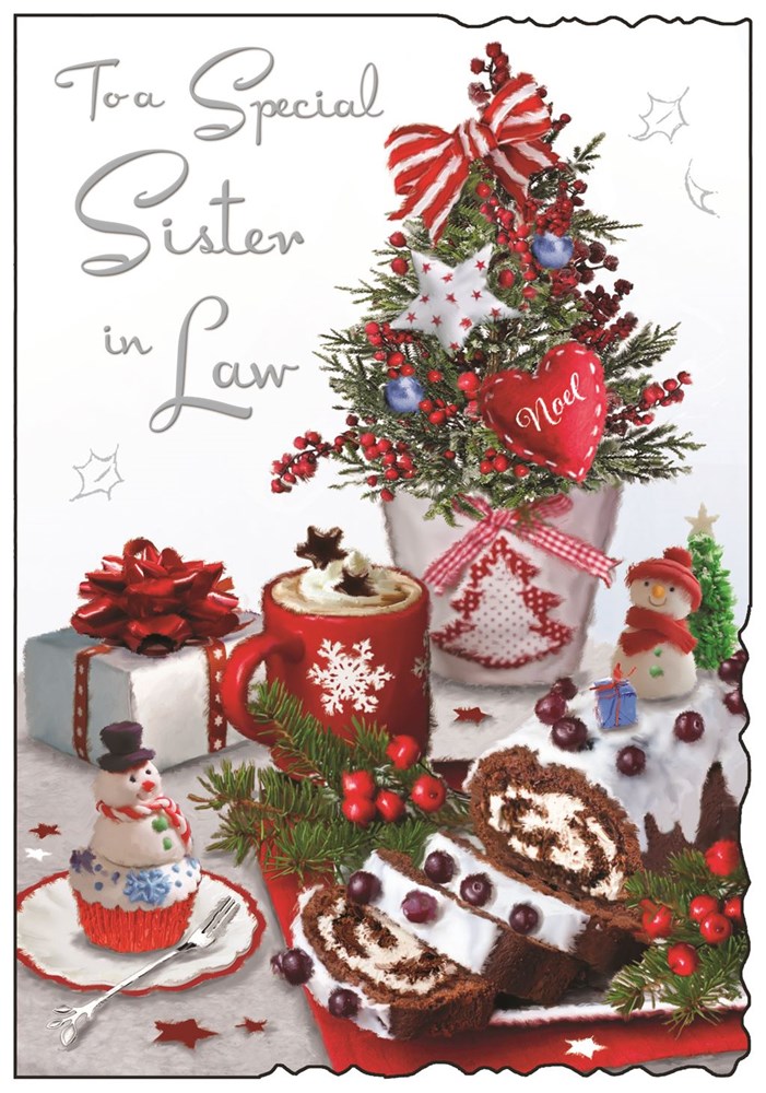 Jonny Javelin Sister-in-Law Christmas Card With Envelope - Mini Xmas Tree Yule Log and Cupcake Finished with Silver Foil and Glitter