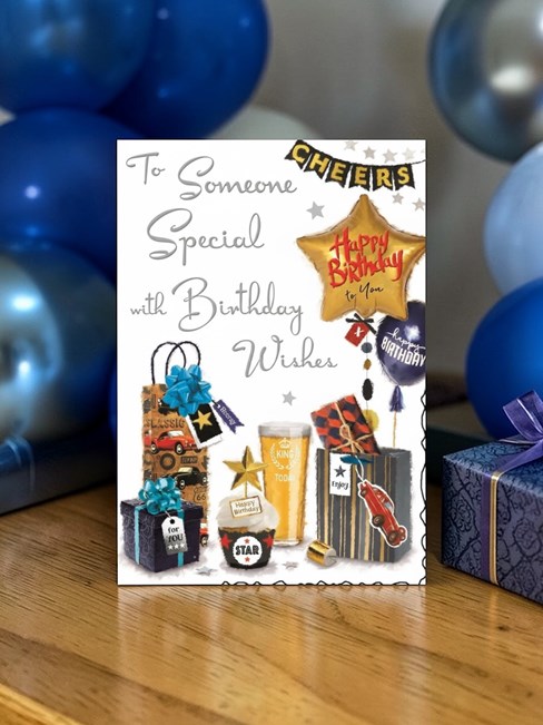 Jonny Javelin Someone Special Birthday Card With Envelope - Beer, Gift Bags, Cupcake and Balloons Design