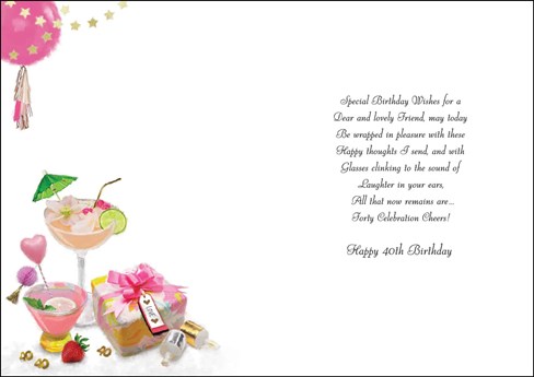 & inside has an insert printed with the same design and reads: Special Birthday Wishes for a Dear and lovely Friend, may today be wrapped in pleasure with these happy thoughts I send, and with glasses clinking to the sound of laughter in your ears, All that now remains are ... Forty Celebration Cheers! Happy 40th Birthday