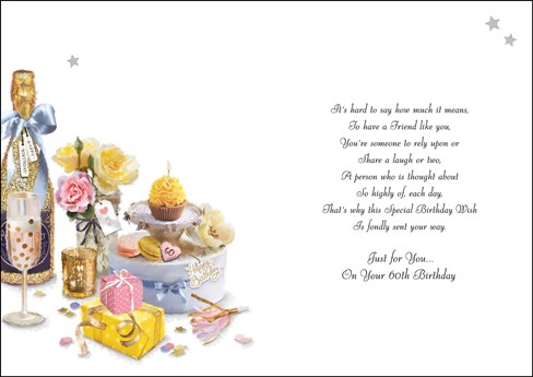 & inside has an insert printed with the same design and reads: It's hard to say how much it means, to have a Friend like you, you're someone to rely upon or share a laugh or two, A person who is thought about so highly of each day, That's why this special Birthday wish is fondly sent your way. Just for you ... On your 60th Birthday