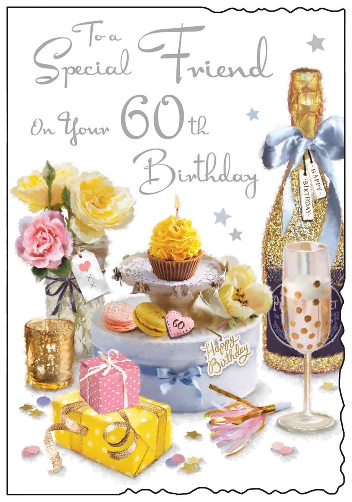 Jonny Javelin Special Friend 60th Birthday Card & Envelope - Champagne Cake and Flowers Design
