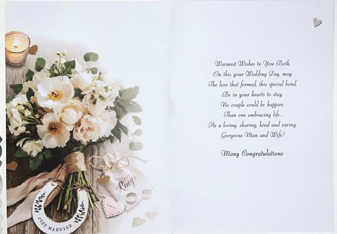 & inside has an insert printed with the same design and reads: Warmest Wishes to you both, on this your Wedding Day, may the love that formed, this special bond, be in your hearts to stay, no couple could be happier, than one embracing life ... As a loving, sharing, kind and caring Gorgeous Man and Wife! Many Congratulations