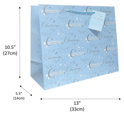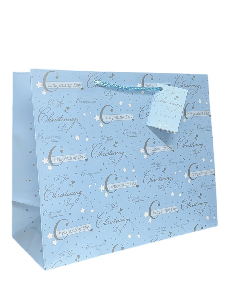 Large Christening Boy Gift Bag With Rope Handle and Attached Gift Tag