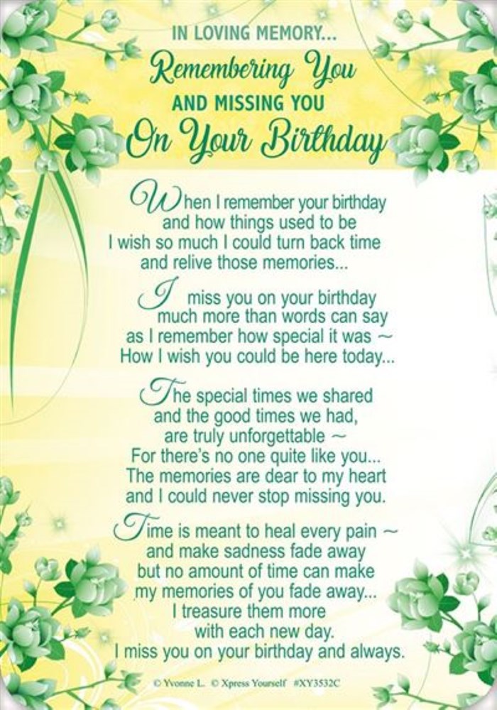The Card Reads: In Loving Memory ... Remembering You and missing you on Your Birthday. When I remember your birthday and how things used to be I wish so much I could turn back time and relive those memories...I miss you on your birthday much more than words can say as I remember how special it was ~ How I wish you could be here today...The special times we shared and the good times we had, are truly unforgettable ~ For there's no one quite like you ...The memories are dear to my heart and I could never stop missing you. Time is meant to heal every pain ~ and make sadness fade away but no amount of time can make my memories of you fade away ...I treasure them more with each new day. I miss you on your birthdays and always