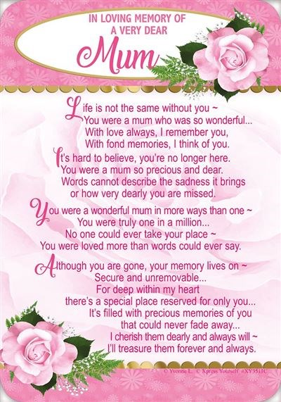 The card reads: In Loving Memory of a very dear Mum. Life is not the same without you ~ You were a mum who was so wonderful...With love always, I remember you, With fond memories, I think of you. It's hard to believe, yo're no longer here. You were a mum so precious and dear. Words cannot describe the sadness it brings or how very dearly you are missed. You were a wonderful mum in more ways than one ~ You were truly one in a million...No one could ever take your place ~ You were loved more than words could ever say. Although you are gone, your memory loves on ~ Secure and unremovable...For deep within my heart there's a special place reserved for only you...It's filled with precious memories of you that could never fade away...I cherish them dearly and always will ~ I'll treasure them forever and always
