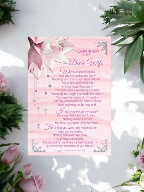 The card reads: In Loving Memory of My Dear Wife ~ Words cannot describe how sad this makes me feel ~ knowing you're no longer here with me...You were a wonderful wife in more ways than one ~ You were truly a woman in a million...You made me laugh, you made me smile ~ You were the centre of my world ~ A loving companion and dearest friend from beginning to the very end. I miss you with all mu heart ~ It's a loss that's so hard to bear...Nothing makes it easier knowing that you're no longer here...For all that you were, and meant to me I miss you endlessly...Nothing can ever take away my precious memories. I'm grateful for the time we had together ~ I'' cherish my memories of you forever