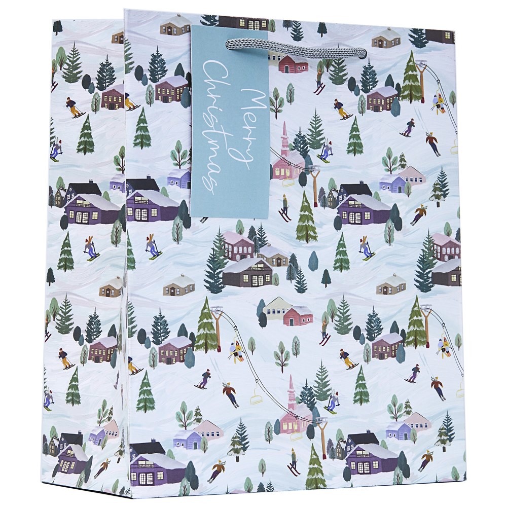 Medium Christmas Gift Bag - Rope Handle & Tag Scenic Alpine Ski Village 10x8.5"
