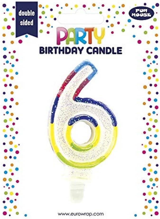 Number 6 Multicoloured Double Sided Glitter Birthday Party Candle