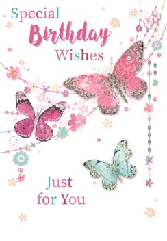 Open Female Birthday Card With Envelope - Pink and Blue Butterflies with Flowers