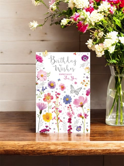 Open Female Birthday Card - Wild Flowers and Butterflies Silver Foil 7.7x5.25