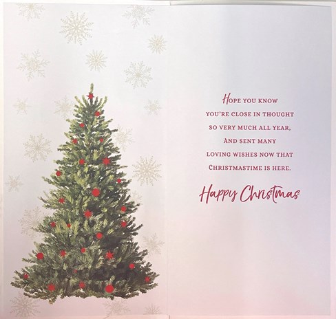 & inside has an insert printed with the same design and reads: Hope you know you're close in thought so very much all year, and sent many loving wishes now that Christmastime is here. Happy Christmas