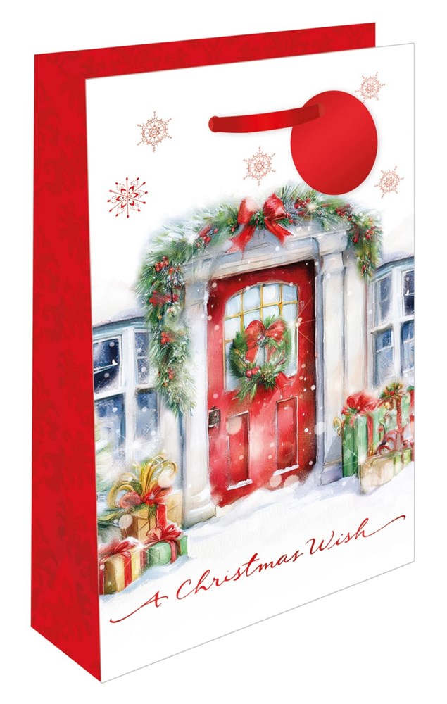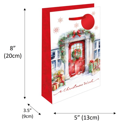 Small Christmas Gift Bag - Wreath on Red Door with Red Foil Finish & Tag 8x5"