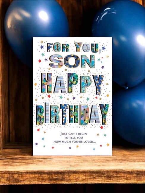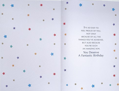& inside has an insert printed with the same design and reads: It's so easy to feel proud of you, not only because of all the things you've achieved, but also because you're such an amazing Son. You deserve a Fantastic Birthday