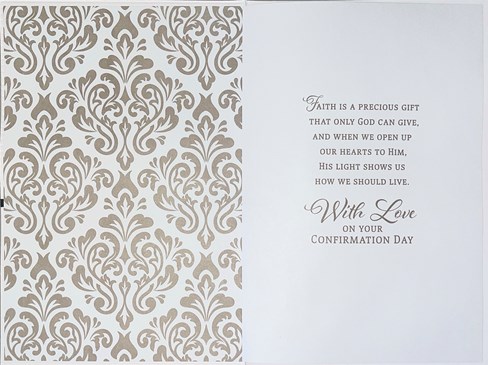 Inside has an insert printed with the same design and reads: Faith is a precious gift that only God can give, and when we open up our hearts to him, his light shows us how we should live. With Love On Your Confirmation Day