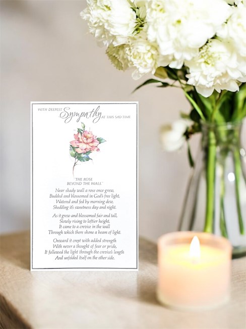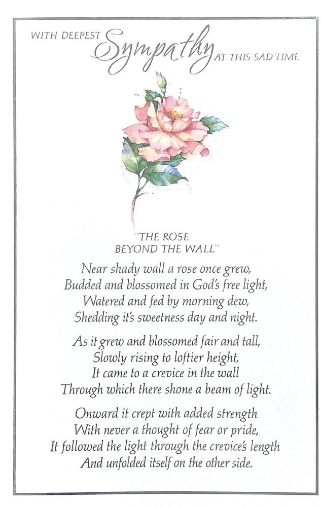 On the front the card reads: With Deepest Sympathy at this sad time "The Rose Beyond the Wall" Near shady was a rose once grew, budded and blossomed in God's free light, watered and fed by morning dew, shedding it's sweetness day and night. As it grew and blossomed fair and tall, slowly rising to loftier height, it came to a crevice in the wall through which there shone a beam of light. Onward it crept with added strength with never a thought of fear or pride, it followed the light through the crevice's length and unfolded itself on the other side