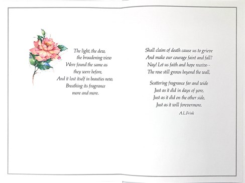 & inside has an insert printed with the same design and reads: The light, the dew, the broadening view were found the same as they were before, and it lost itself in beauties new, breathing its fragrance more and more. Shall claim of death cause us to grieve and make our courage faint and fall? Nay! Let us faith and hope received - the rose still grows beyond the wall, scattering fragrance far and wide just as it did in days of yore, just as it did on the other side, just as it will forevermore. A.L.Frink