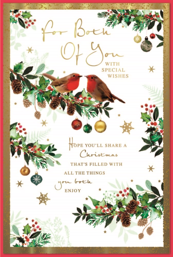 Both Of You Christmas Card With Envelope - Robins on Holly Tree with Gold Foil Verse and Border