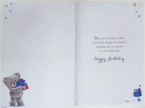 & inside has an insert printed with the same design and reads: Hope this birthday is filled with all the things that you love and hope the year ahead is a very happy one. Happy Birthday