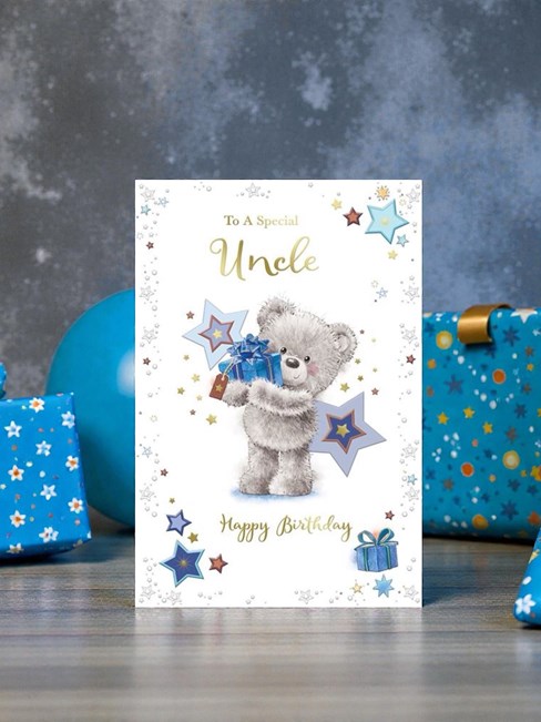 Uncle Birthday Card With Envelope - Bear holding gift with Stars and Gold Foil Finish