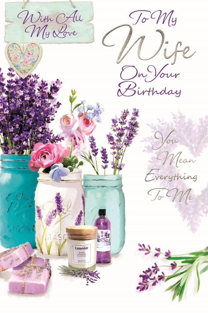 Wife Birthday Card - Lavender and Flowers in Jars with Silver Foil 9x6"